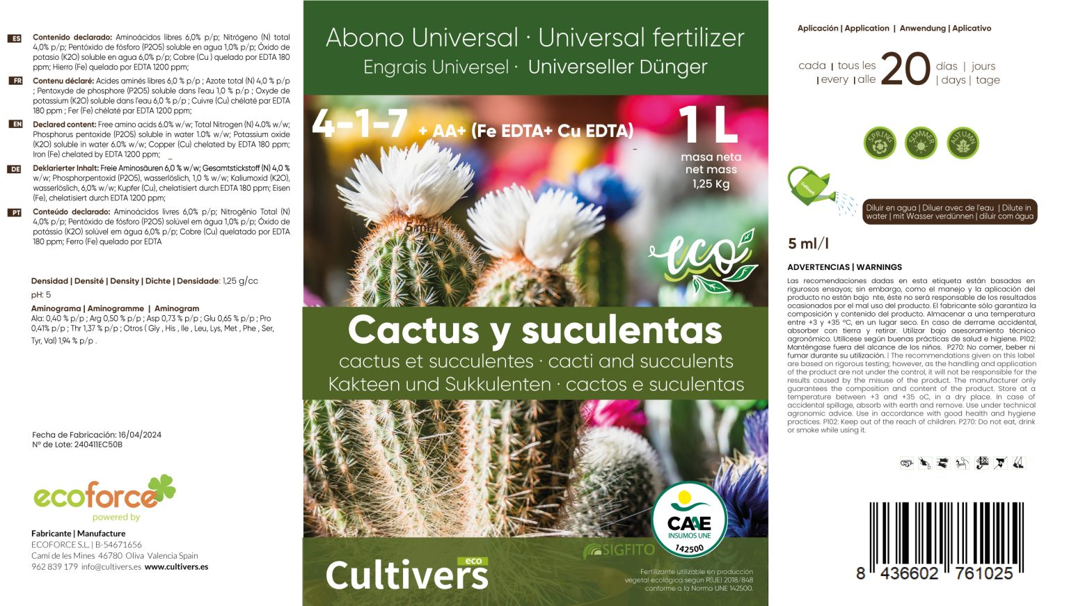 Organic Liquid Cactus Fertilizer is an ecological and organic liquid fertilizer. Formulated to provide optimum nutrition for cacti and succulents. This fertilizer increases plant reserves and promotes balanced development and tissue turgor. Prevents neck rot. This fertilizer also contains amino acids for an adequate and homogeneous growth of the plant.