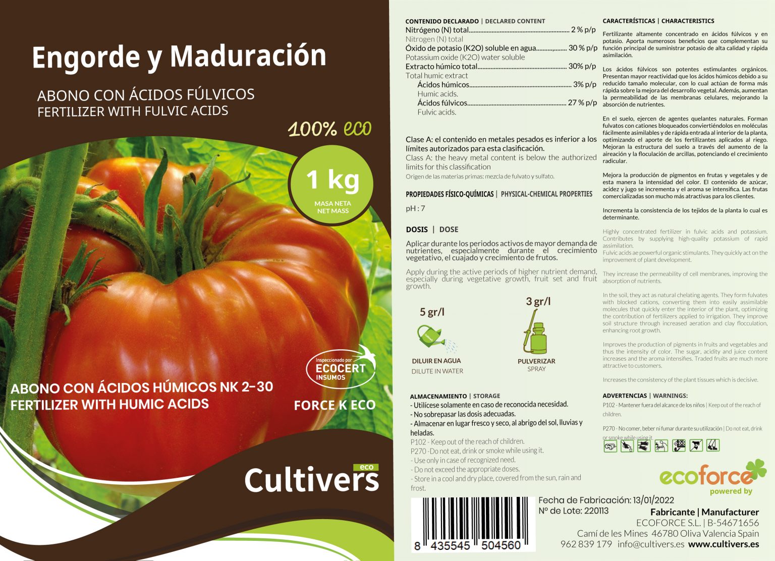 Fattening and Ripening Fertilizer is a fertilizer highly concentrated in fulvic acids and potassium. It provides numerous benefits that complement its main function of supplying high quality and rapidly assimilated potassium.