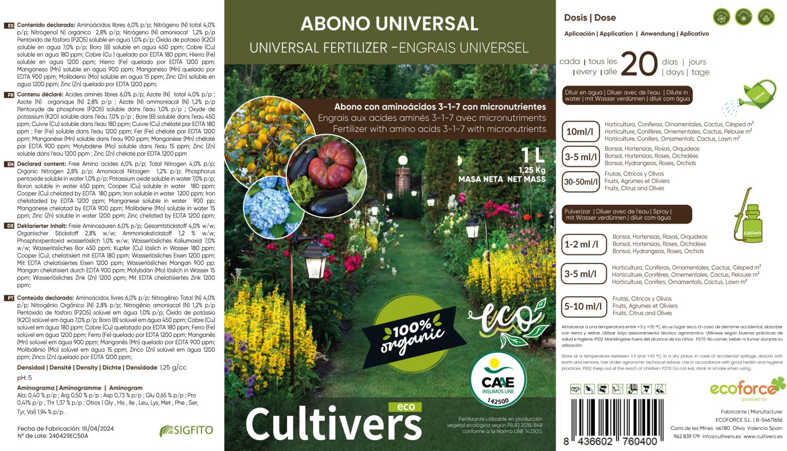 Universal liquid organic fertilizer for all types of indoor and outdoor plants. Healthier and more vigorous plants. Facilitates plant development in stressful situations, allowing better plant recovery. Optimal balance of essential nutrients for vegetative development and fruiting. Solution npk 4-1-7. Combined contribution of macronutrients (nitrogen, phosphorus and potassium) and micronutrients (boron, calcium, iron, manganese, molybdenum and zinc) achieves a more complete and balanced nutrition. Amino acids favor the assimilation of the elements and give it a biostimulating action. Product 100% natural and harmless to animals, environmentally friendly. Liquid universal organic fertilizer. 100% organic and natural fertilizer. Npk solution (4-1-7) with micronutrients (b, cu, fe, mn, mo and zn) with amino acids.