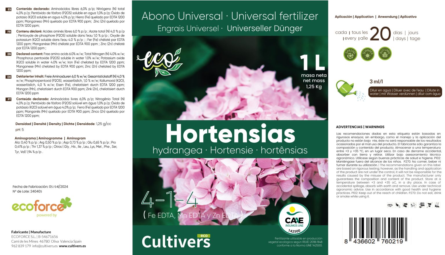 Ecological Liquid Hydrangea Fertilizer. The organic fertilizer for hydrangeas and other acidic plants is a liquid organic formulation that provides a nutritional balance developed to keep the pH of the soil lower. Facilitating the absorption of nutrients by the plant. Recommended to stimulate flowering and controlled growth. Contains chelated iron to maintain the intense green of the leaves.