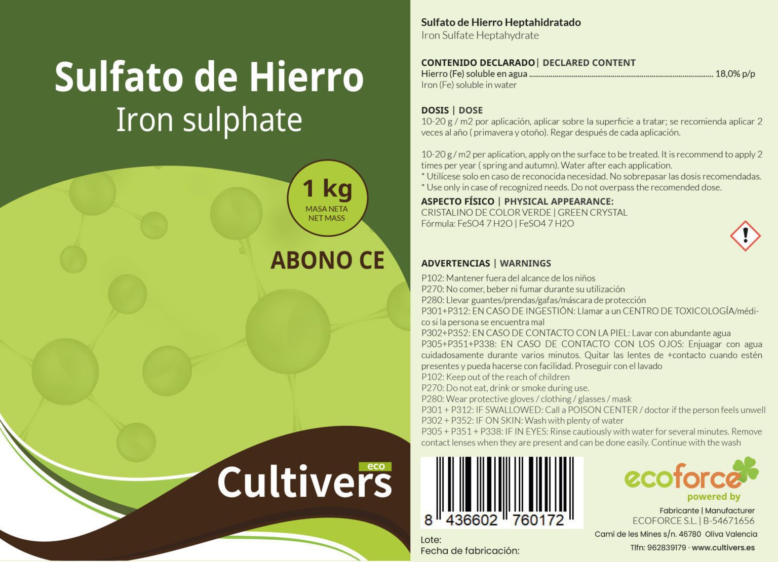 IRON SULPHATE FERTILISER est un produit chimique qui se présente sous la forme d’une poudre cristalline bleu-vert terne ou pâteuse. Il est spécialement conçu pour être utilisé comme engrais et dans le traitement de l’eau potable. Pour les sols carencés en fer, chlorose ferrique, jaunissement des feuilles. Il est également utilisé pour enlever la mousse du sol, pour désinfecter le sol contre les insectes et pour peindre les murs, il donne une couleur rouille, aussi appelé sulfate ferreux, vert, vitriol vert, vitriol de fer, mélanterite.