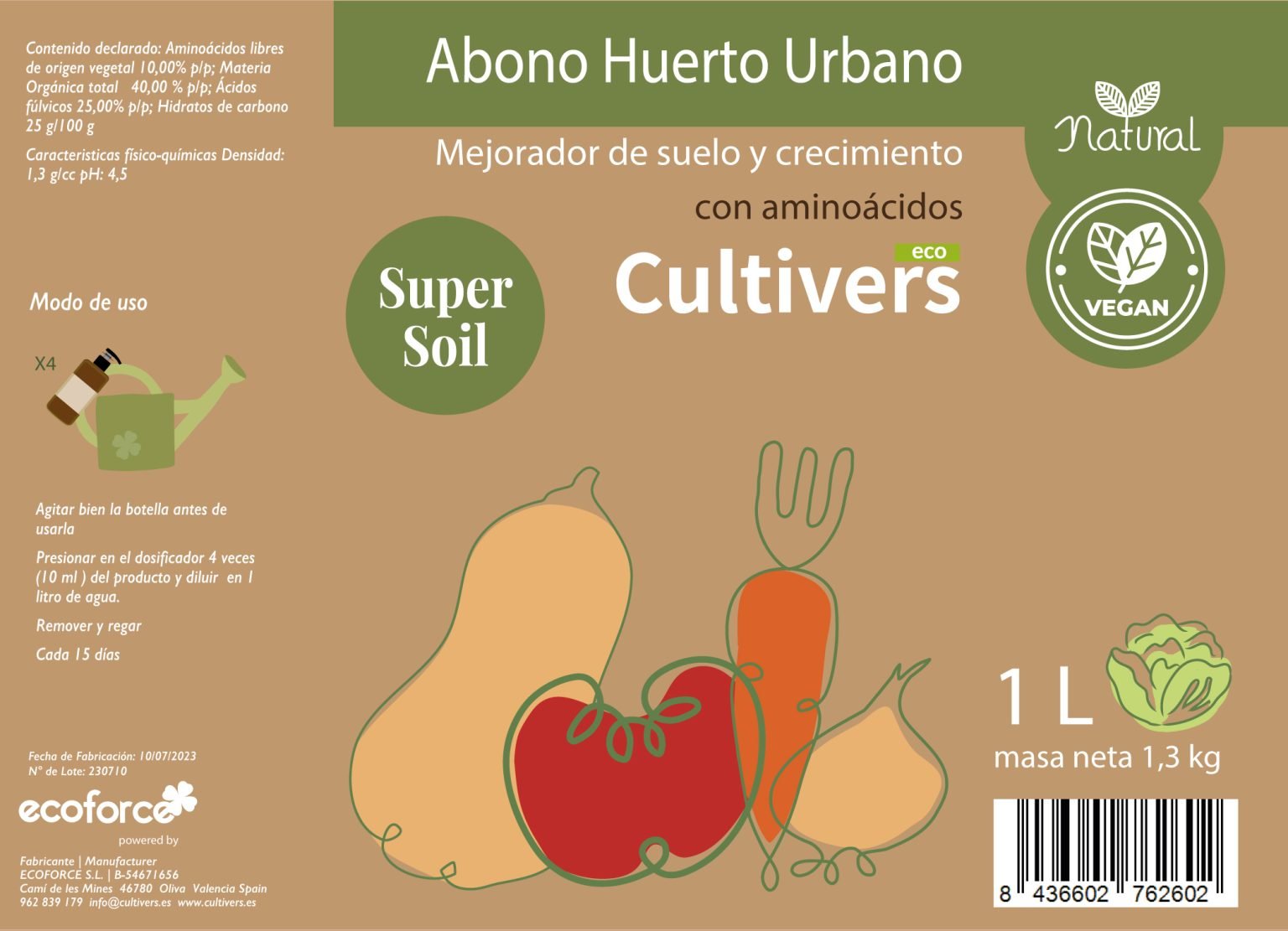 Composizione: Aminoacidi liberi di origine vegetale 10,00% p/p; Sostanza organica totale 40,00% p/p; Acidi fulvici 25,00% p/p; Carboidrati 25 g/100 g