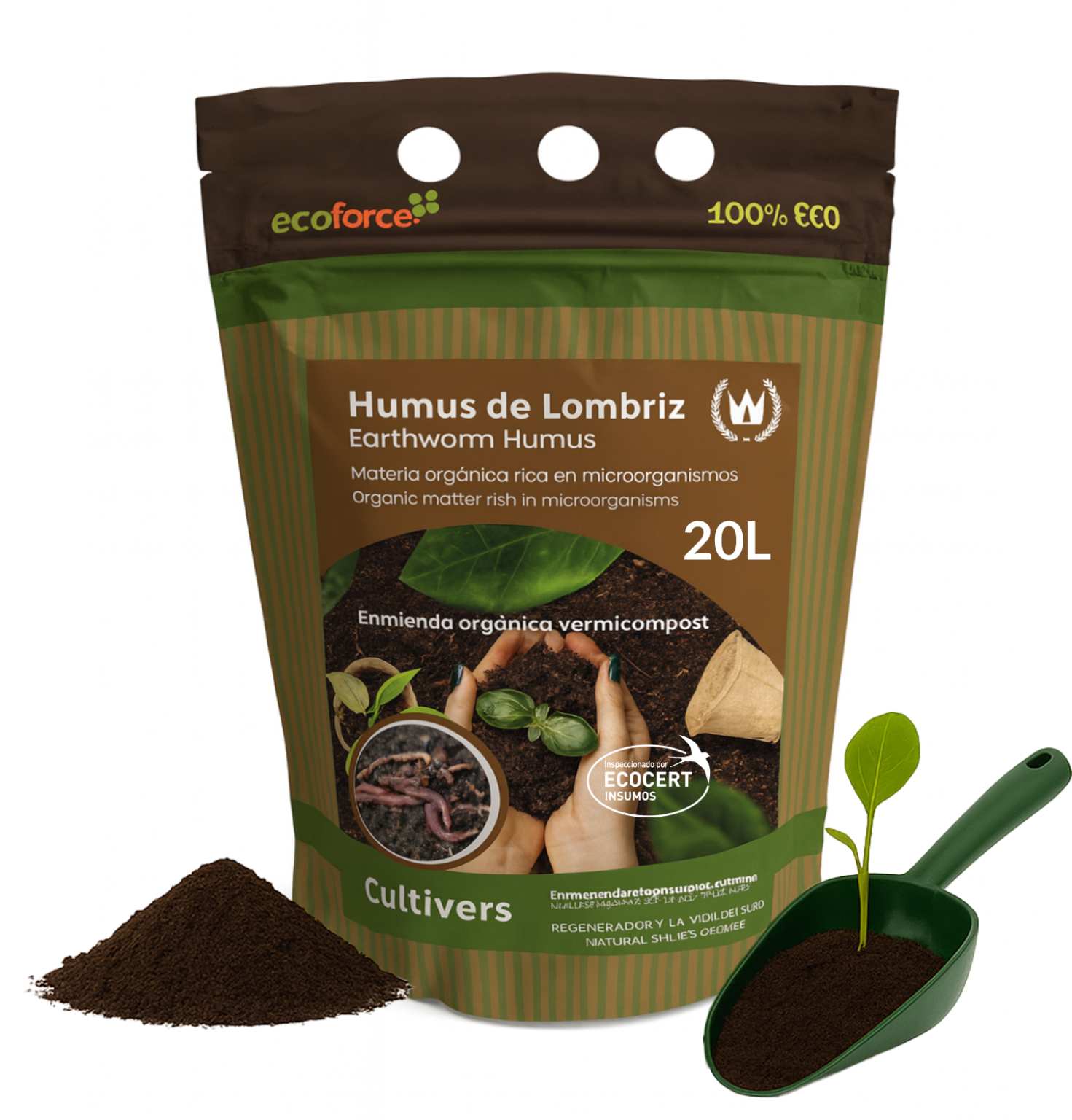 El humus de lombriz ecológico CULTIVERS es un fertilizante orgánico de alta calidad, diseñado para regenerar, nutrir y revitalizar el suelo de forma 100% natural. Su fórmula rica en microorganismos activos no sólo mejora la fertilidad del terreno, sino que también protege tus cultivos gracias a su capacidad para neutralizar patógenos y residuos tóxicos presentes en la tierra.