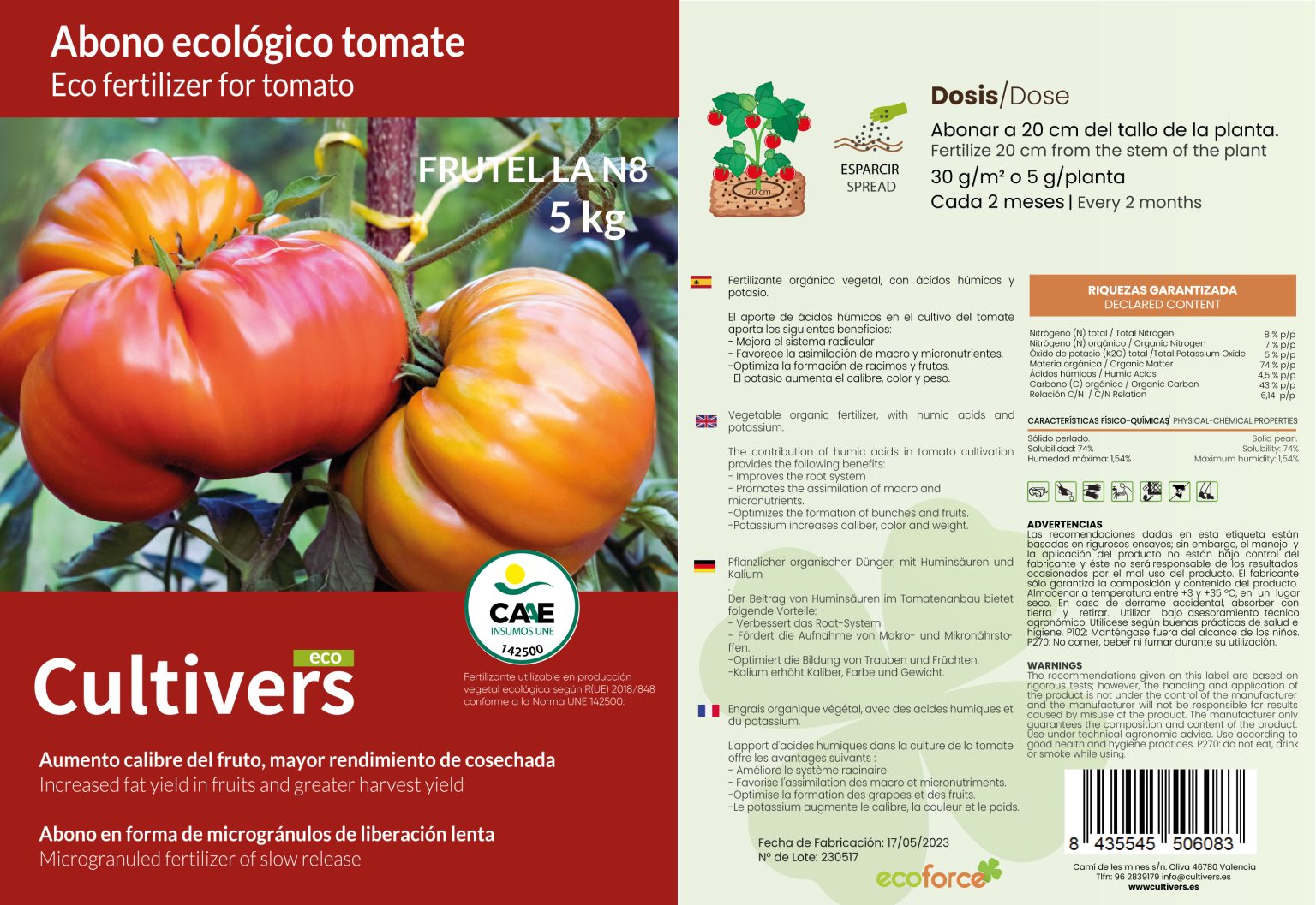 CULTIVERS Fertilizante Orgânico para Tomate. Fertilizante de origem 100% orgânica e microgranulado natural. Melhora a produtividade das culturas