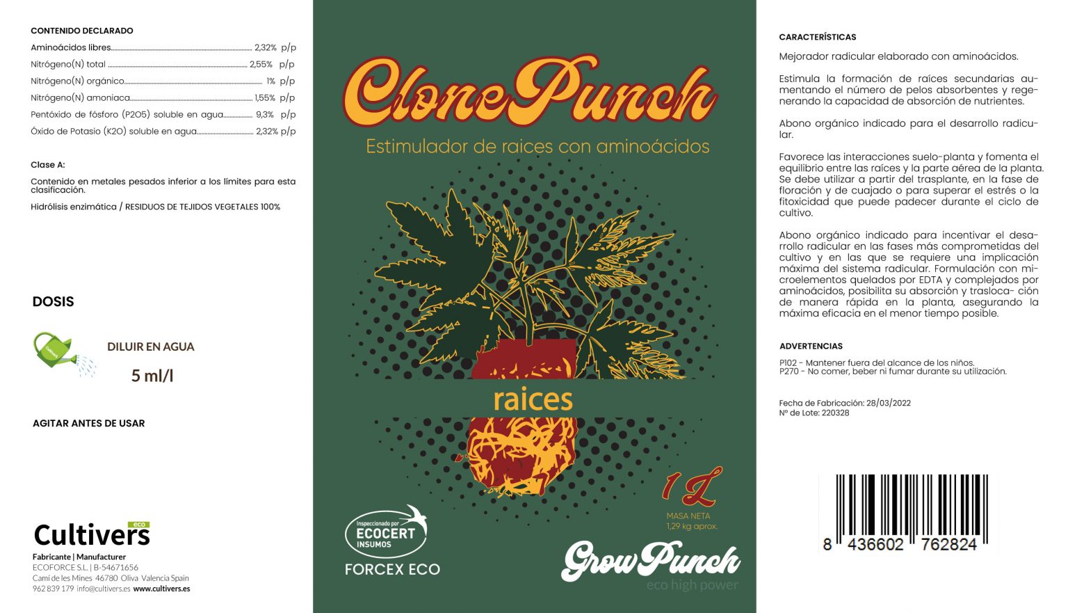 ClonePunch Rooting Booster 1 L Orgânico. Intensificador de raízes feito com aminoácidos.